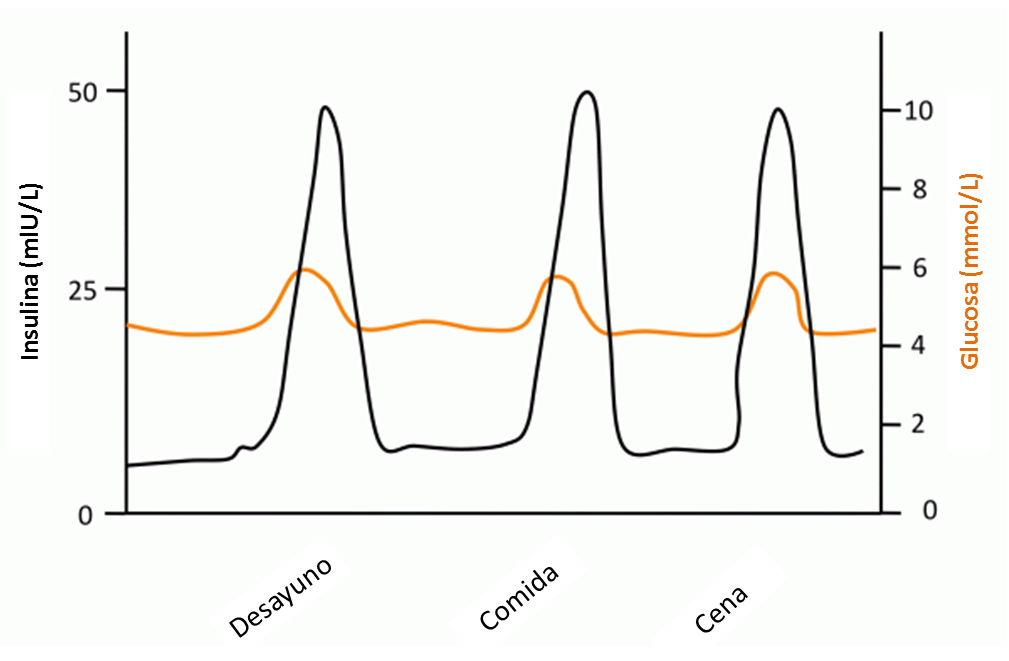 En individuos sanos existen dos ritmos de secreción de insulina que se superponen: uno basal, que regula constantemente los niveles de glucemia; y uno en forma de picos como respuesta a las comidas, que facilita la utilización de los nutrientes ingerido; la producción de estos picos de insulina es una situación fisiológica, y es imprescindible para la correcta regulación del metabolismo energético. En personas sanas se repite un ciclo constante de hiperglucemia - hiperinsulinemia - hipoglucemia reactiva a lo largo del día, cuyas oscilaciones serán tanto más pronunciadas conforme mayor sea la cantidad de hidratos de carbono que se consume.